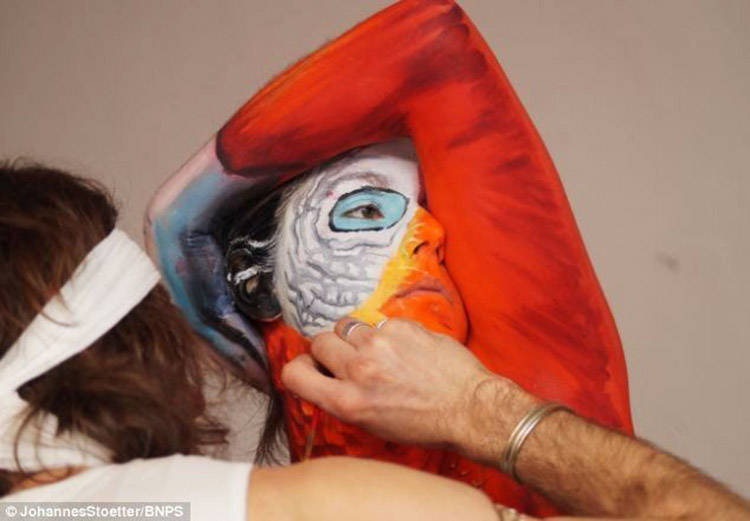 Detalle de la cara de la modelo, en la que ahora sí apreciamos bien su rostro que representa el ojo del loro y su brazo rojo que representa la cabeza del ave