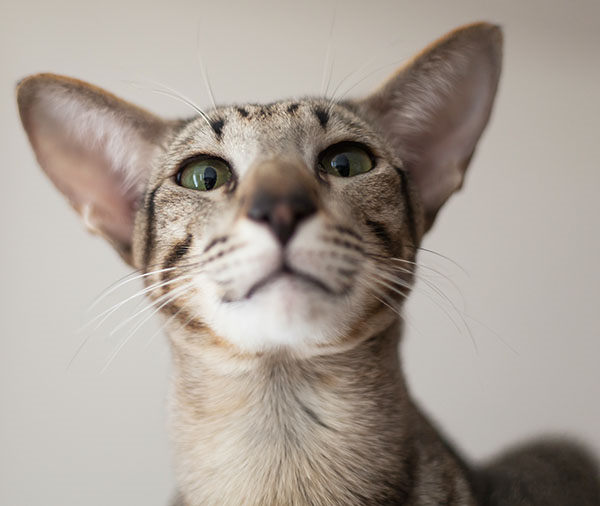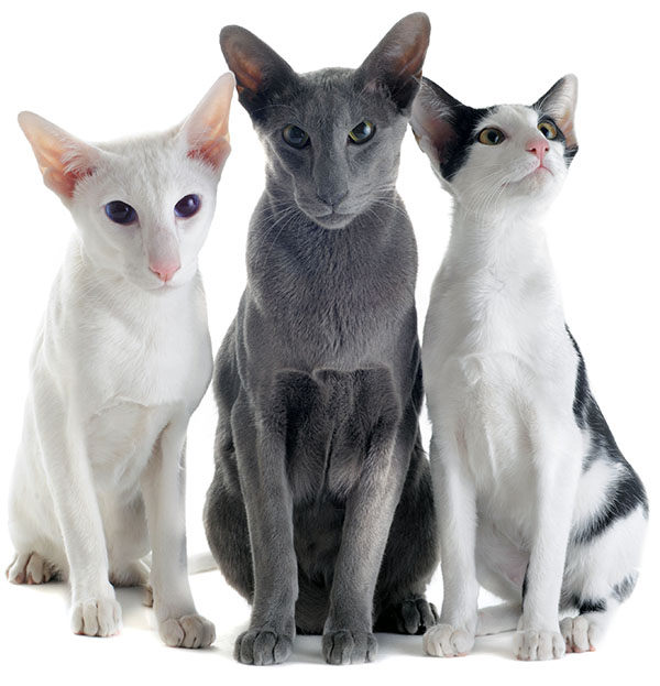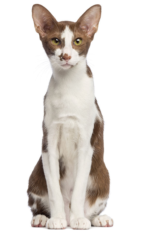 El gato oriental es una raza esbelta y estilizada, de largas extremidades. Son de tamaño medio y su peso medio es de 2,5 a 5 kilos. Su pelo corto hace que sean fáciles de cuidar. Es inteligente, con un carácter curioso, divertido y sociable, siempre al lado de su dueño.