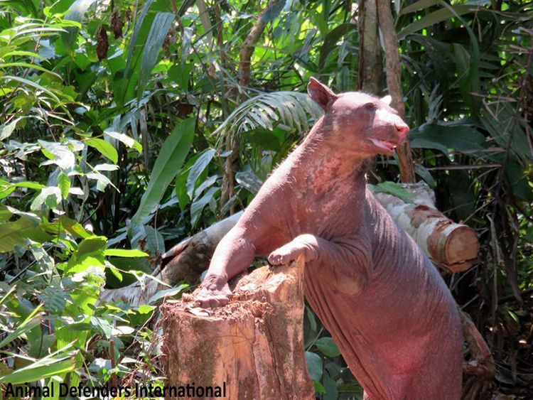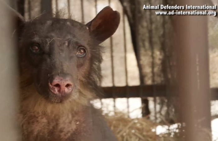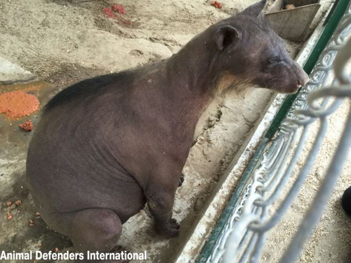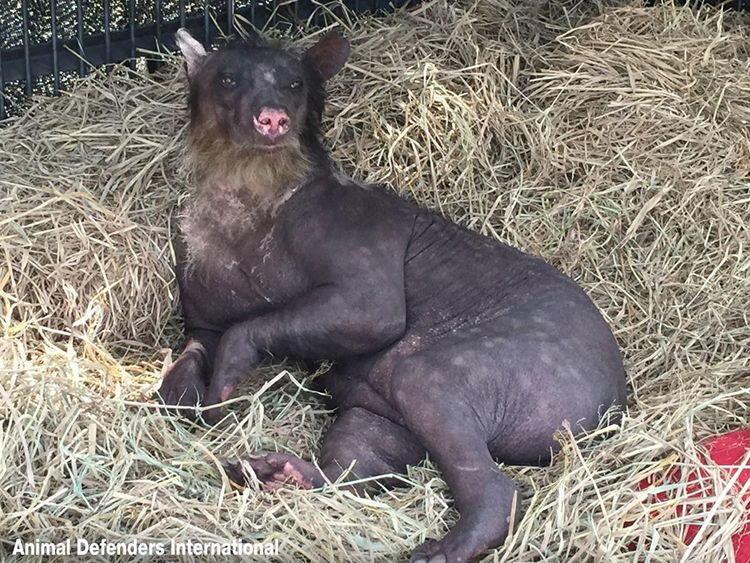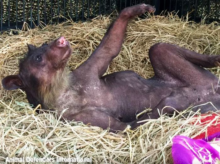 Con esta vida, el oso sufrió tanto estrés que poco a poco fue perdiendo su bello pelo, hasta ahora en que es un oso calvo completamente.