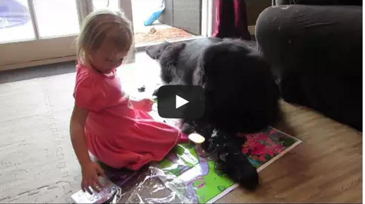 Vídeo tierno protagonizado por una niña que está jugando tranquilamente en el salón de su casa. Pero de repente su gran amigo Sebastian, un precioso perro de raza Terranova encuentra muy comodo el lugar en el cual la niña juega. Ella sin molestarse acepta a Sebastian tumbado entre sus juguetes ! haha