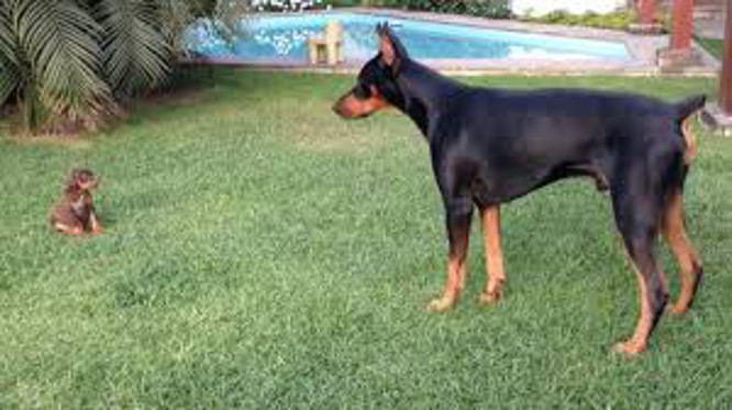 Mira como este adorable cachorro llamado Kyra reta a Boss, un perro de raza doberman mucho más grande que ella ! Observad como juegan en el patio trasero de la familia . Kyra no tiene miedo a este adorable Doberman, para que luego digan que es una raza peligrosa…